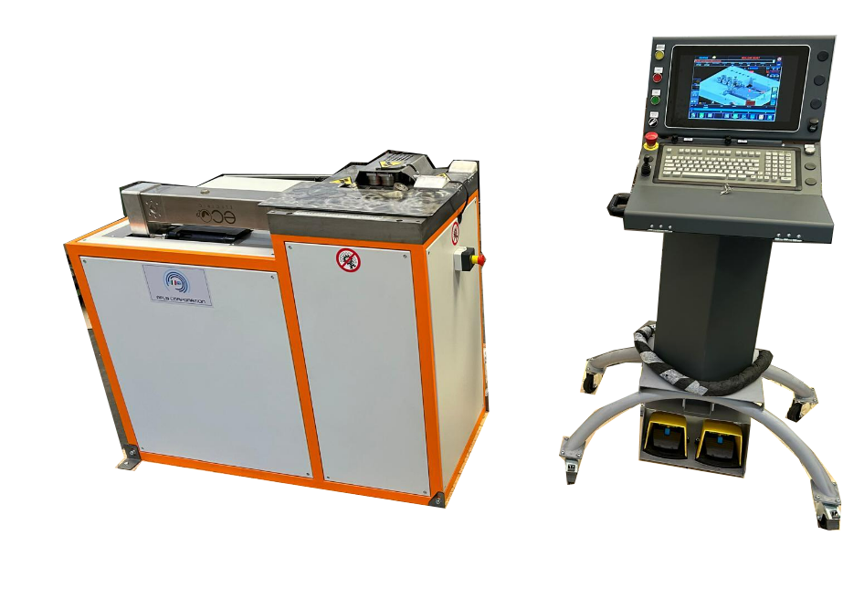 Straight-guided dual control machine for the field of coils, heat exchangers, boilers, etc.Nine interpolated axes with 11 totally electric motors